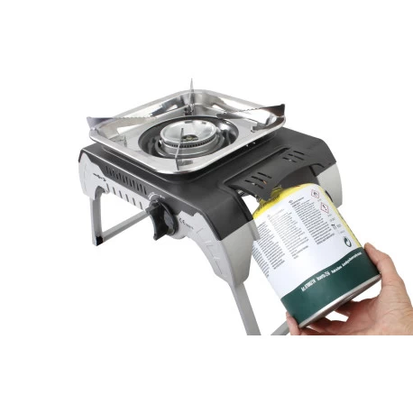 Fornello a gas portatile in accaio inox, con gambe pieghevoli.