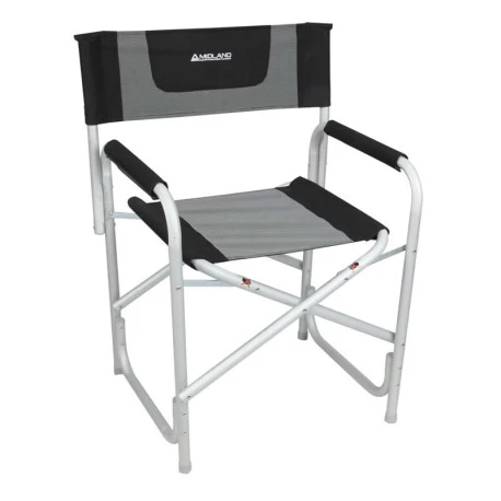 Sedia regista con struttura in alluminio. Seduta, schienale e braccioli in poliestere antisdrucciolo imbottito.