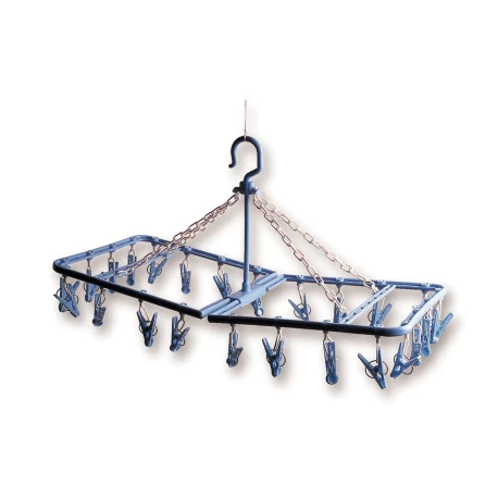 Stendibiancheria rettangolare in plastica con telaio pieghevole.
