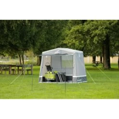 Tenda ripostiglio con classico tetto a falde realizzato in tessuto spalmato su entrambi i lati. Tutte le cuciture del tetto sono nastrate.