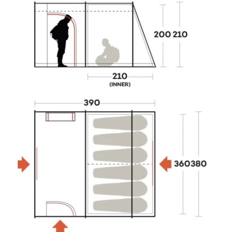 Ingresso e aerazione: Ampio abside anteriore. Cuffie e finestre di aerazione. Ingresso frontale, laterale e posteriore. Sistema “Air Ventilation System” con ampia zanzariera; prese d’aria e finestre per ventilare la tenda. Porta frontale e laterale doppio tetto con zanzariera interna. Finestre trasparenti sulla parte frontale del doppio tetto